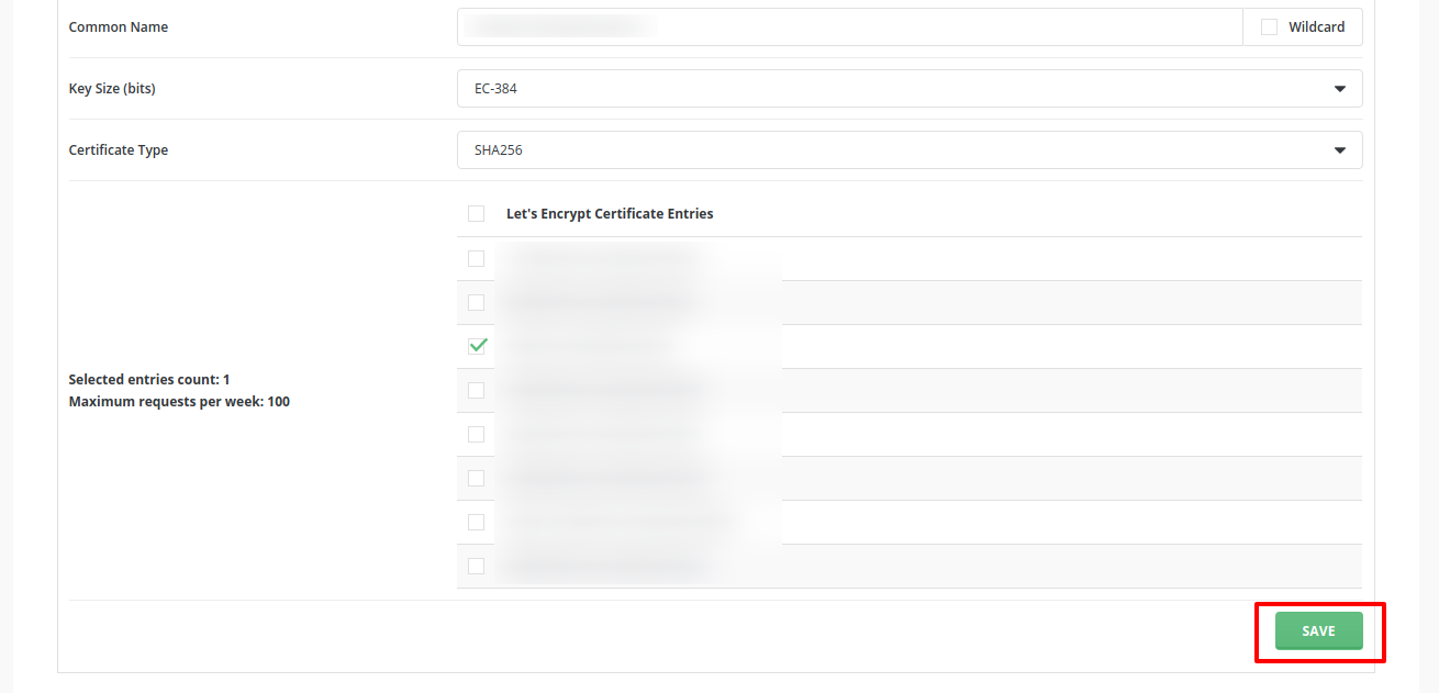 - блок "Selected entries count". В указанном меню нужно проставить галочки напротив тех доменных имен и поддоменов, для которых вы хотите установить сертификат. Обращаем ваше внимание на то, что для установки сертификата, доменные имена (поддомены), для которых выдается сертификат, должны быть направлены на текущий сервер.